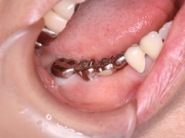 右下のブリッジのふちの一部分に角化歯肉がなく、可動粘膜になっています。このような状態だと歯ブラシが当たりにくく、お口のケアがとても困難です。