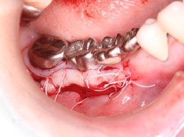 問題の部位に歯周外科処置を行います。移植する角化歯肉は上あごから採取します。角化歯肉が必要な面積を決定し、歯茎を開きます。